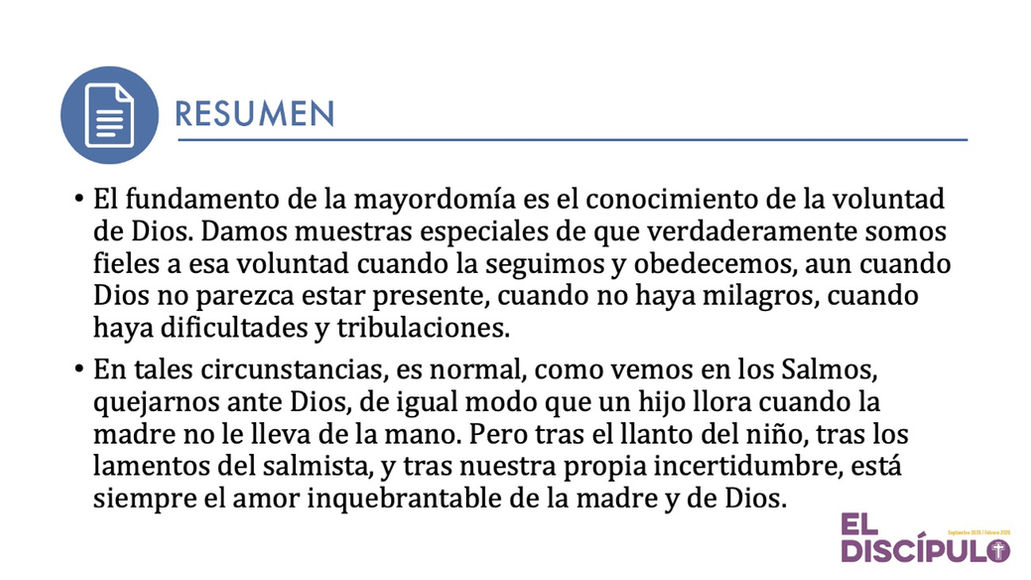 • Aprender a ver, reconocer y aceptar la presencia de Dios en casos en que esa presencia no se manifiesta en portentos, y parece que Dios nos abandona.